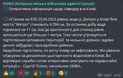 На днях начальник КГВА Сергей Попко заявлял, что власти города и все службы готовы к потенциальным чрезвычайным ситуациям. Также говорилось, что предполагаемый максимальный уровень половодья на Днепре в пределах Киева не представляет угрозы промышленным объектам и жилым массивам.