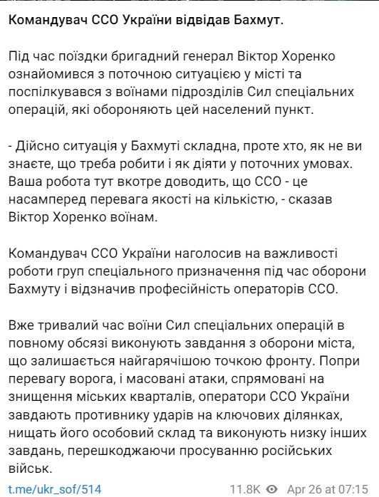 "Действительно, ситуация в Бахмуте сложная, однако кто, как не вы знаете, что нужно делать и как действовать в текущих условиях. Ваша работа здесь еще раз доказывает, что ССО - это, прежде всего, преимущество качества над количеством", - сказал Виктор Хоренко.