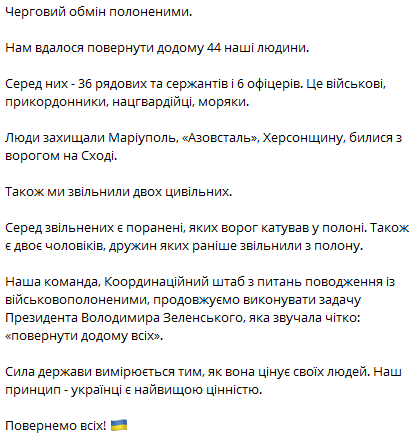 Глава Офиса президента Андрей Ермак сообщает, что в Украину вернулись 44 человека. Среди них – 36 рядовых и сержантов и шесть офицеров.
