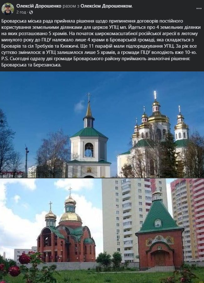 "Речь идет о 4 земельных участках, на которых расположено 5 храмов. К началу широкомасштабной российской агрессии в феврале прошлого года ПЦУ принадлежало только 4 храма в Броварской громаде, состоящей из Броваров и сел Требухов и Княжичи.