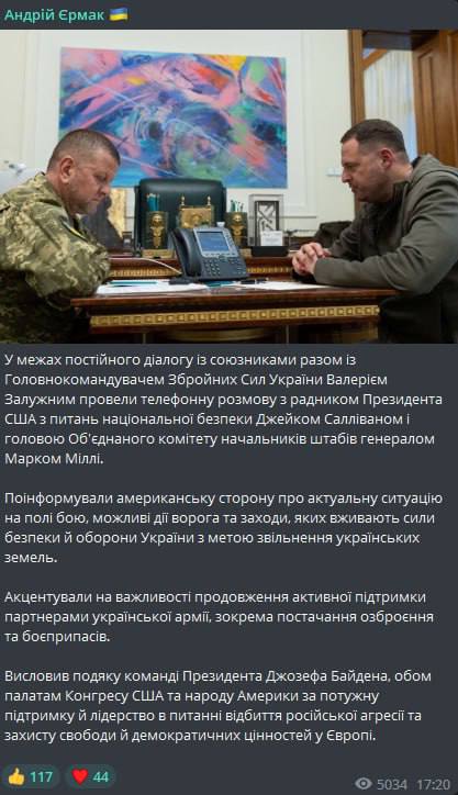 Глава Офиса президента Андрей Ермак и главком ВСУ Валерий Залужный провели очередные телефонные переговоры с советником Президента США по вопросам национальной безопасности Джейком Салливаном и председателем Объединенного комитета начальников штабов генералом Марком Милли.