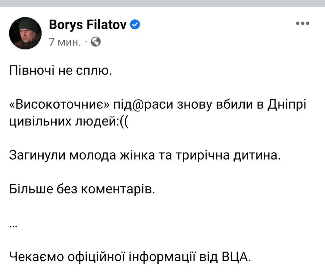 07.10 О прилётах в Днепре сообщает мэр города Борис Филатов.
