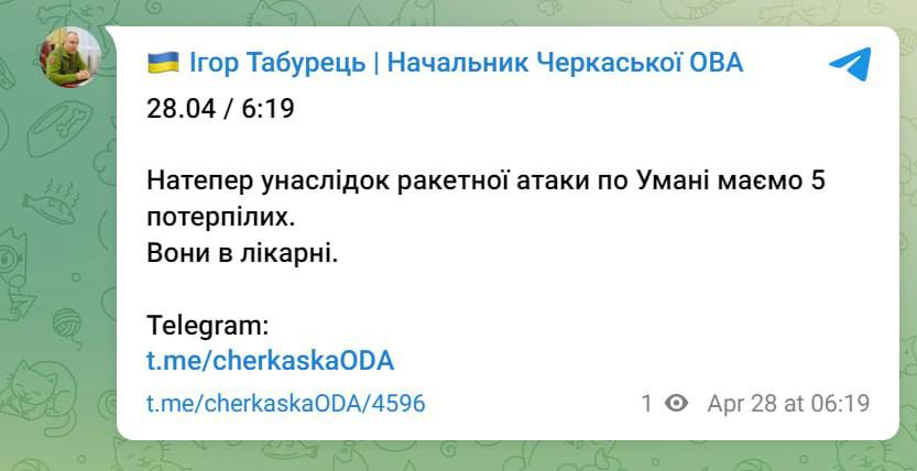 07.15 После удара в Умани - 5 пострадавших сообщает глава Черкасской ОВА.