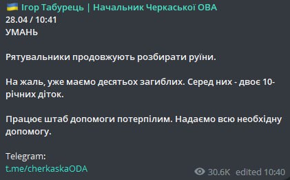 10.57 Среди десяти погибших в Умани - двое десятилетних детей, сообщают в местной ОВА.