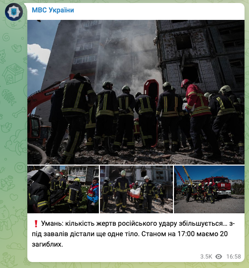 Число погибших в Умани Черкасской области в результате сегодняшнего ракетного удара возросло до 20 человек. Еще 18 — ранены, 9 из них находятся в больнице.