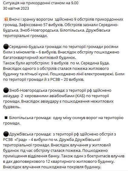 В Середино-Будской громаде российские вооруженные силы били из минометов и РСЗО, в результате обстрела поврежден многоквартирный жилой дом. В Зноб-Новгородской - был осуществлен авиаудар управляемыми авиабомбами, в результате повреждены нежилые здания. На территорию Белопольской громады была сброшена одна мина. В Дружбовской - враг совершил обстрел из РСЗО "Град", в результате попадания в жилой дом произошел пожар и повреждены помещения отделения банка.