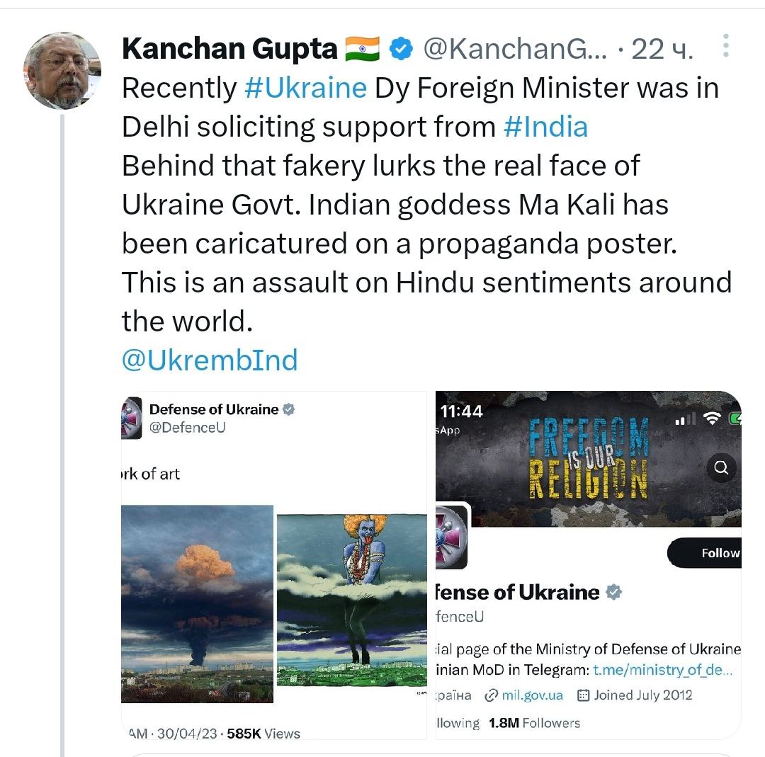 За этой фальшивкой скрывается настоящее лицо правительства Украины. Индийская богиня Ма Кали была изображена карикатурно на пропагандистском плакате. Это нападение на индуистские настроения во всем мире", - написал в Твиттере старший советник индийского Мининформа Каншан Гупта.