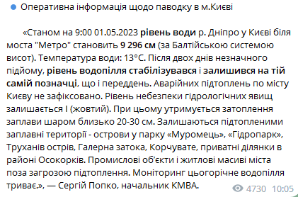 Ситуация остается под контролем, и мониторинг нынешнего половодья продолжается. Жители города Киева могут быть спокойны: силы и средства украинских спасательных служб находятся в постоянной готовности и готовы принять меры в случае необходимости.