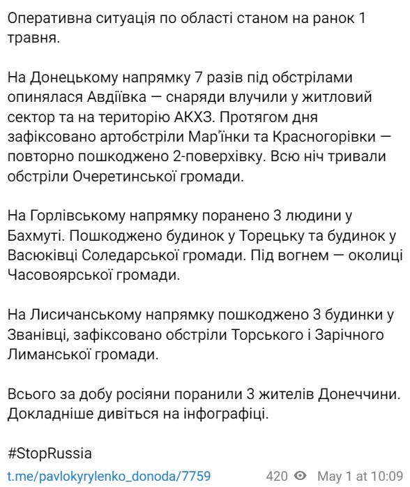 Война в Украине продолжается уже 432-й день. Мы следим за новостями 1 мая в своем онлайне.