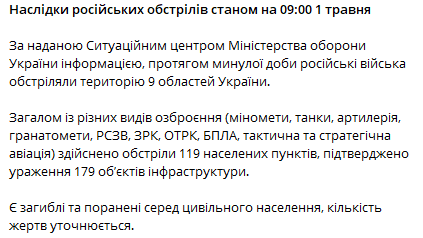 За последние 24 часа российские военные обстреляли 119 населенных пунктов в 9 областях Украины. Это привело к поражению 179 объектов инфраструктуры.