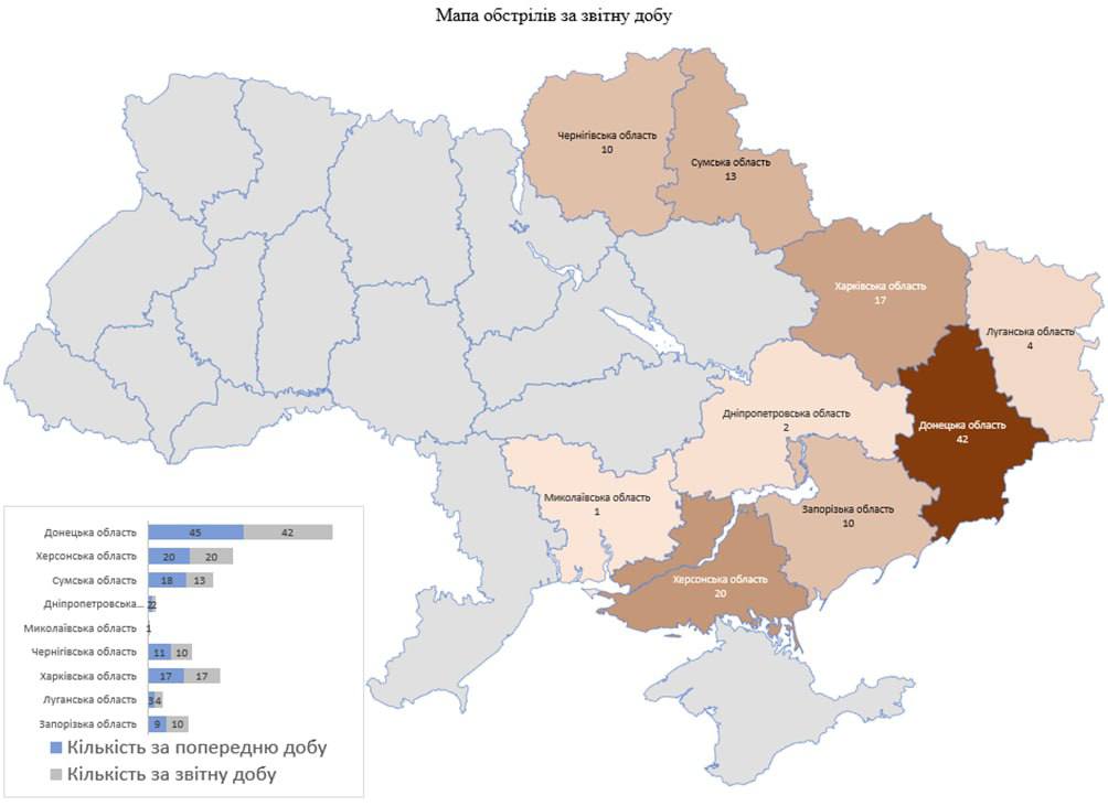 Наибольшее количество обстрелов произошло в Донецкой области - 42. В Херсонской области было обстреляно 20 населенных пунктов, в Харьковской - 17, в Сумской - 13, в Запорожской и Черниговской по 10, в Луганской - 4, в Днепропетровской - 2 и в Николаевской - 1.