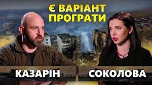В интервью телеведущей 5 канала Янине Соколовой (на обложке в YouTube оно, к слову, называется "Есть вариант проиграть") Казарин не призывал к перемирию, но проводил мысль о том, что для него победой в войне будет являться само по себе сохранение украинской государственности "на определенной части страны", а призывы воевать до выхода на границы 1991 года готов слышать лишь от "людей в пикселе".