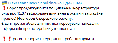 В Черниговской области в результате обстрела неработающего образовательного учреждения в Новгород-Северском районе погиб ребенок, который находился неподалеку.