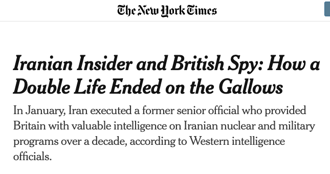 Издание пишет, что в 2019 власти Ирана получили информацию о двойной работе Акбари от российской разведки. Тогда он был арестован, а в январе этого года казнен.