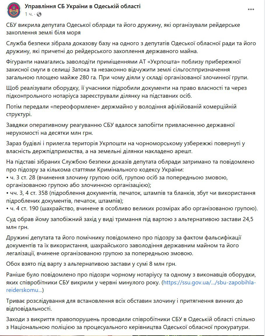 "Чтобы реализовать сделку, ее участники подделали документы на право собственности и через подконтрольного нотариуса зарегистрировали участок на подставных лиц. Затем передали "переоформленное" госимущество во владение аффилированной коммерческой структуре. Сейчас здания и близлежащая территория Укрпочты на черноморском побережье возвращены в собственность госпредприятия, а на земельные участки наложен арест", - заявляют в СБУ.