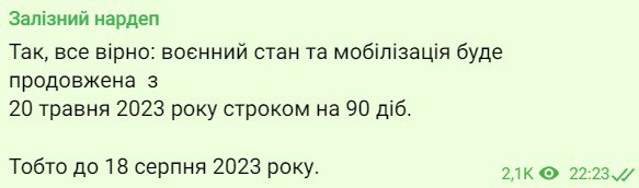 Военное положение и мобилизация в Украине будут продлены с 20 мая 2023 года сроком на 90 суток - то есть до 18 августа 2023 года.