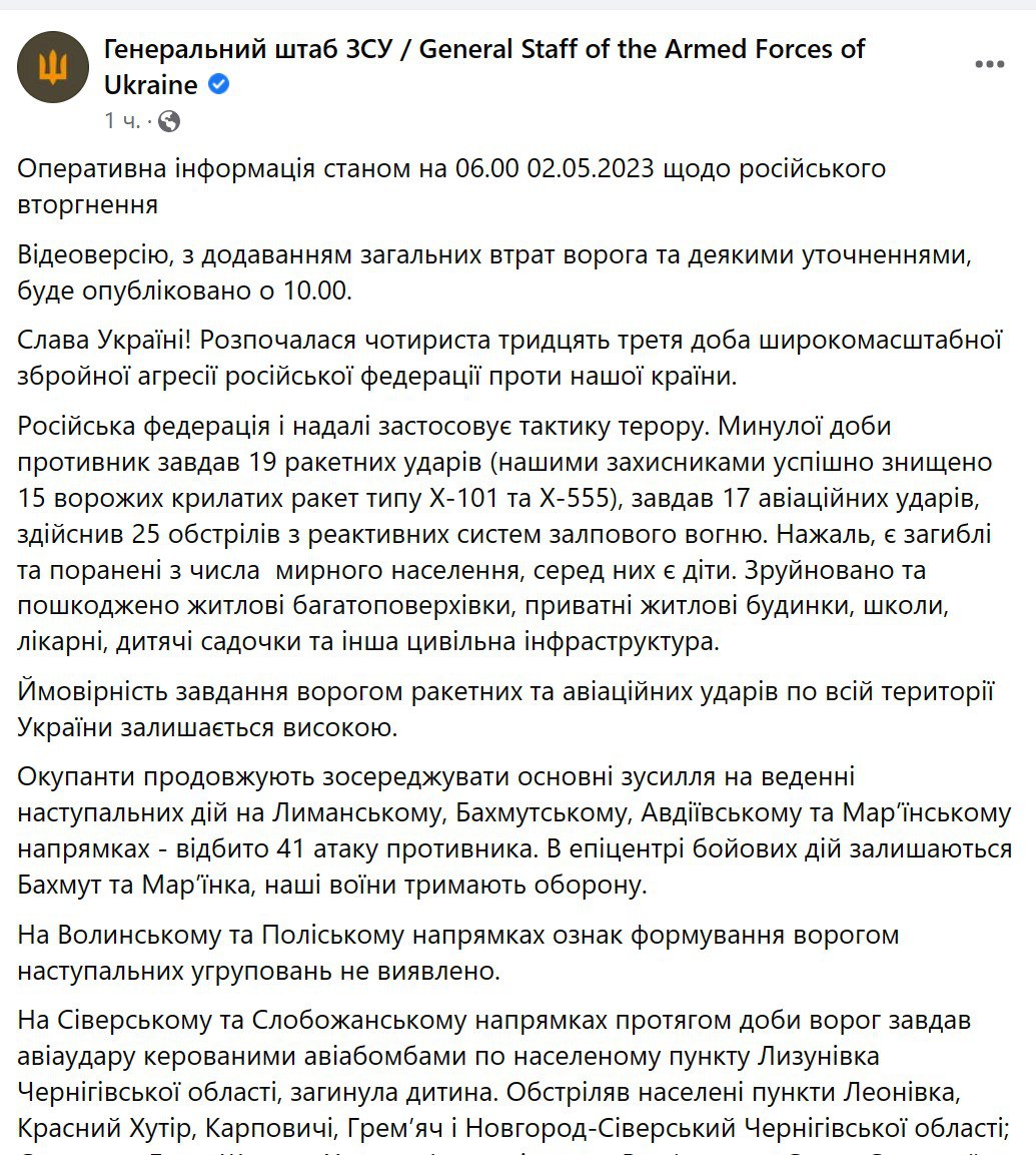 Продолжаются бои за Бахмут, также были попытки наступления на Предтечино. Россияне нанесли авиаудары по Бахмуту и Белой Горе.