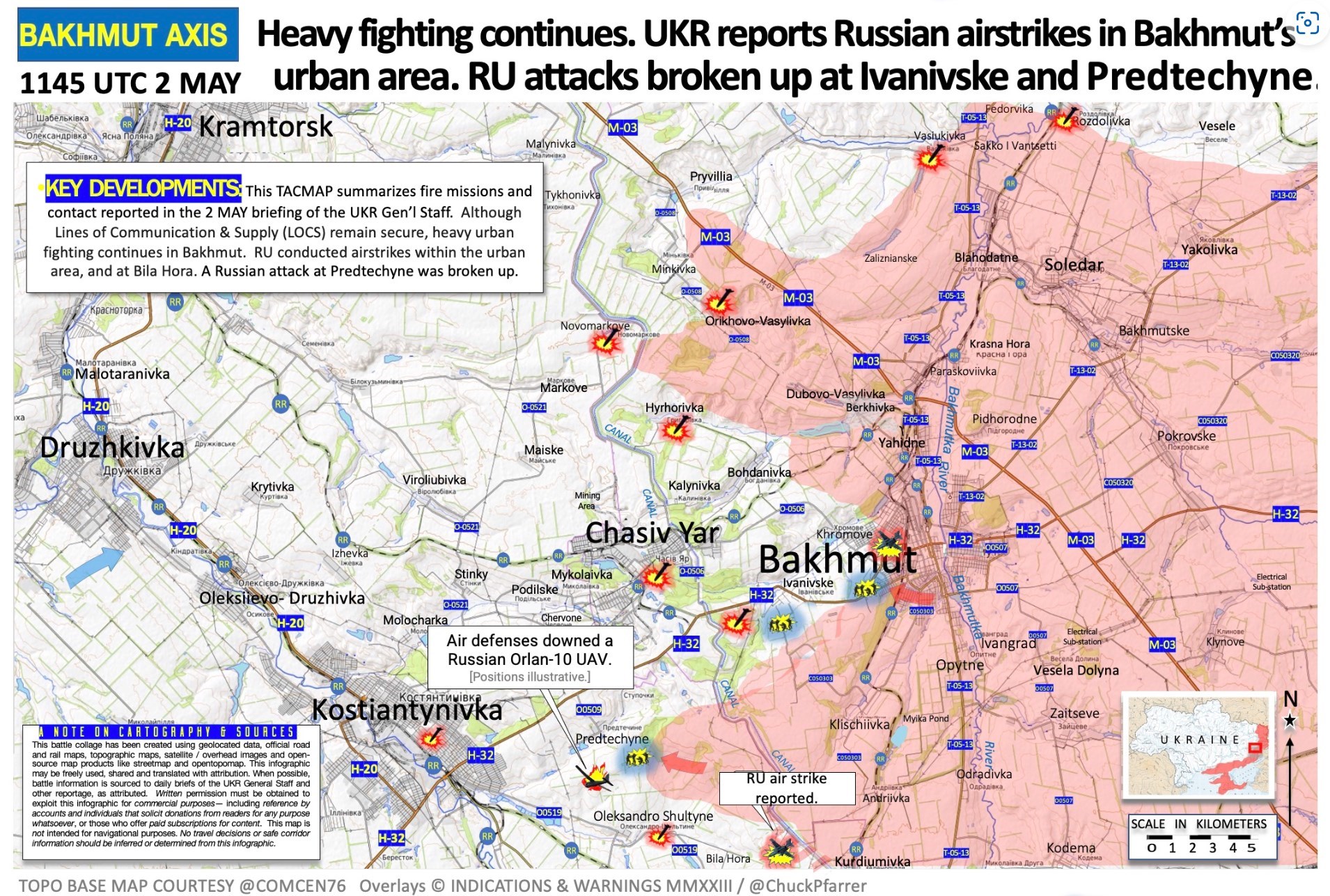 Институт изучения войны пишет, что российские силы прошли вперед в западном Бахмуте, а также двигаются по трассе Бахмут-Северск, к югу от села Сакко-и-Ванцетти.