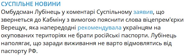 Но затем Верещук заявила совершенно обратное: призвала не принимать гражданство РФ и дождаться ВСУ.