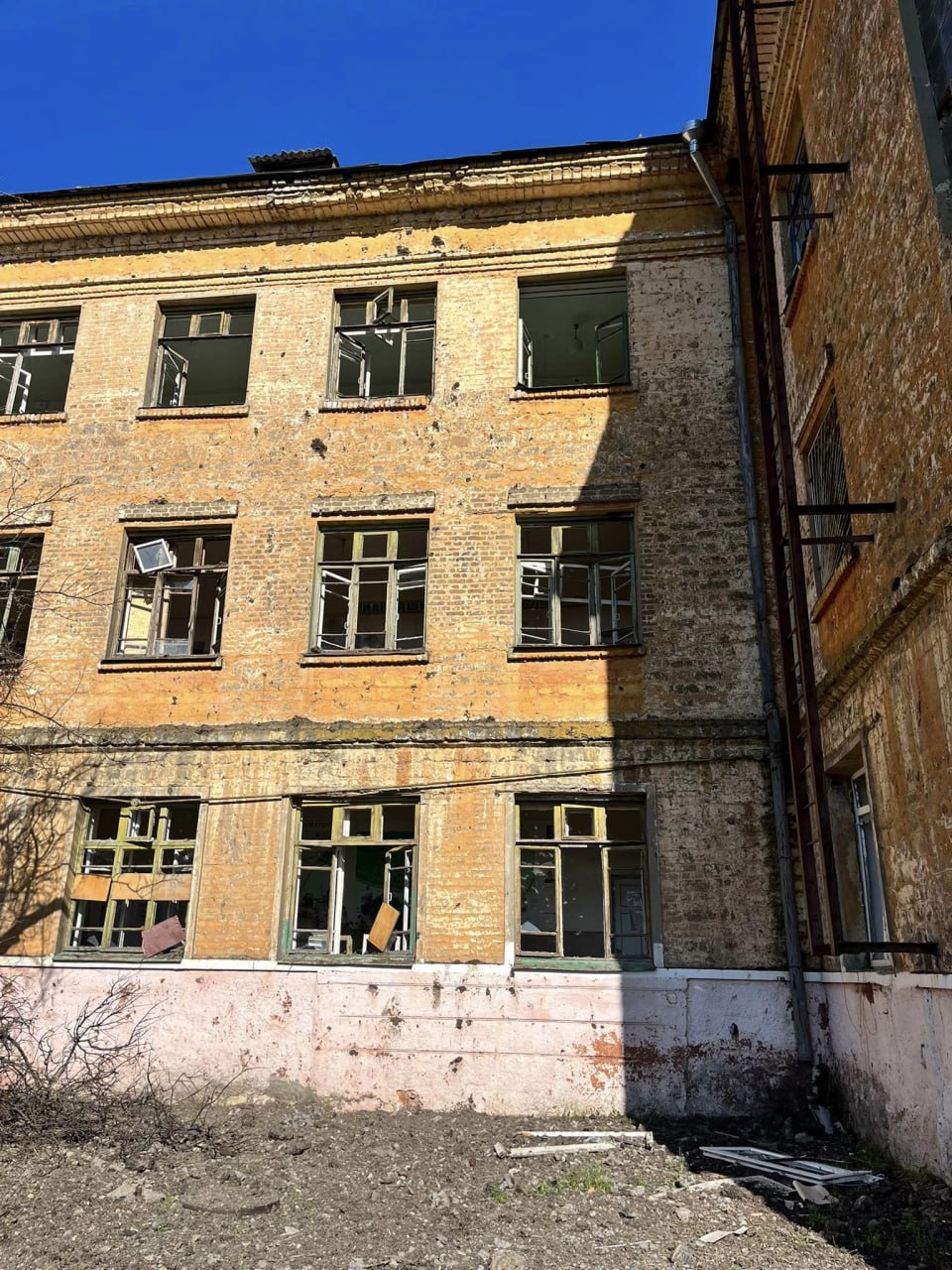 Повреждена школа, 14 многоэтажек, больница и детский центр реабилитации. Ранен сторож.