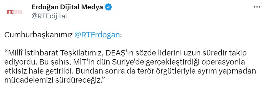 "Национальная разведка Турции долго следила за лидером "ИГИЛ" Абу Хусейном Аль-Курейши. Этот человек был убит вчера в Сирии в ходе операции, которую провела турецкая разведка", - говорится в сообщении Эрдогана.
