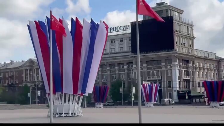 На центральной площади Донецка развешены красные флаги. По Мариуполю ездит машина с красным флагом, которая транслирует песни военных лет и сводку от Совинформбюро о взятии Берлина в 1945 году.