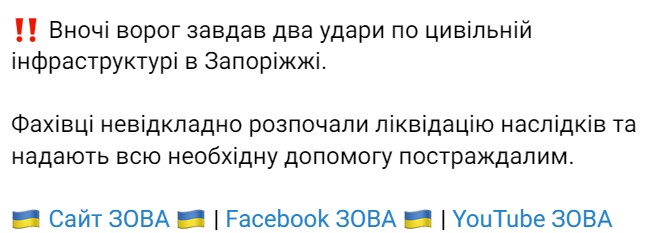 Ночью россияне нанесли два удара по гражданской инфраструктуре в Запорожье. Есть раненные, но их количество не уточняется.