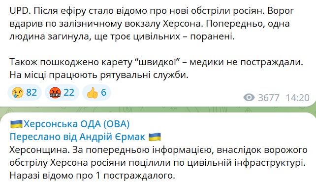 Российская армия ударила по железнодорожному вокзалу Херсона. По предварительным данным, один человек убит, трое ранено.