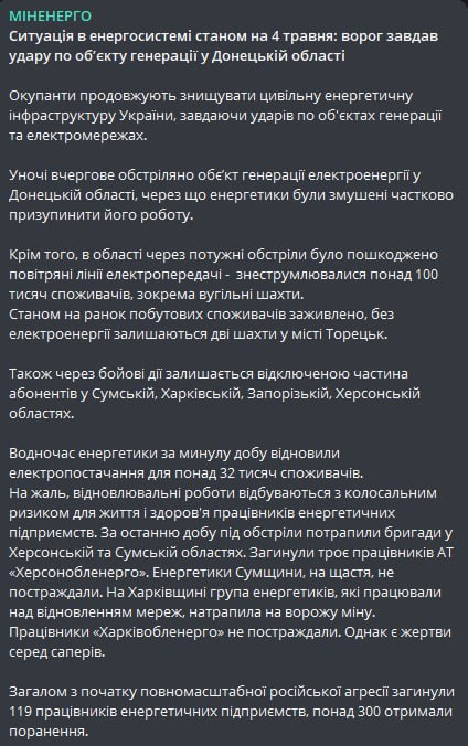 По данным Минэнерго, из-за боевых действий часть абонентов в Сумской, Харьковской, Запорожской, Херсонской областях также остается без света.