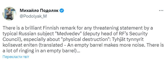 "На любое угрожающее высказывание типичного российского субъекта "Медведева", особенно по поводу "физического уничтожения", есть блестящая финская поговорка: Tyhjät tynnyrit kolisevat eniten (пустая бочка громче звенит)", - заявил Подоляк.