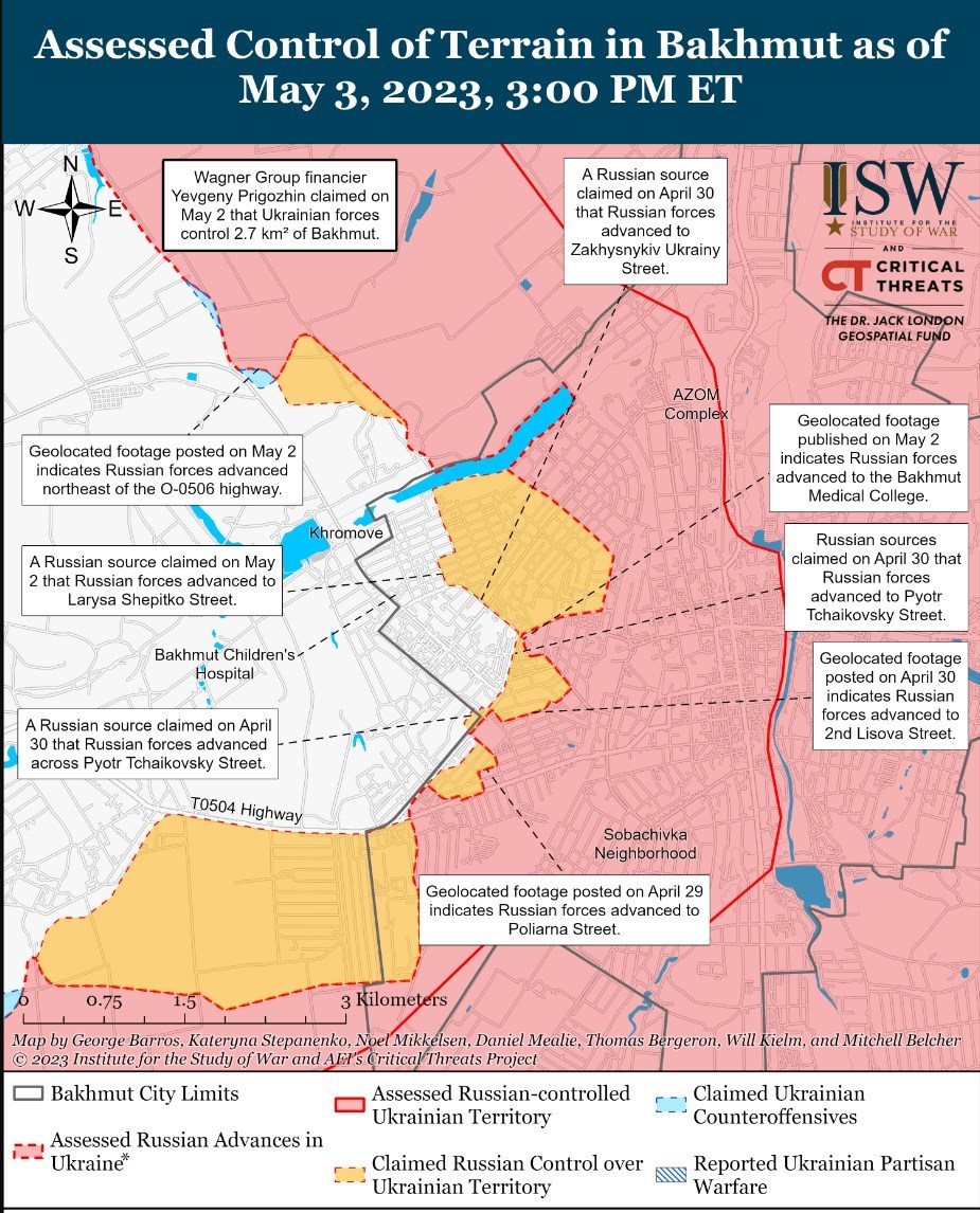 Как сообщает Институт изучения войны, россияне продвинулись ближе к шоссе к северо-западу от Хромово и захватили Бахмутский медицинский колледж.