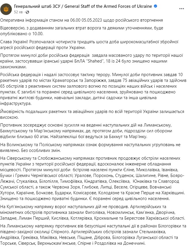 В пятницу, 5 мая, в Украине идет уже 436-й день войны с РФ.
