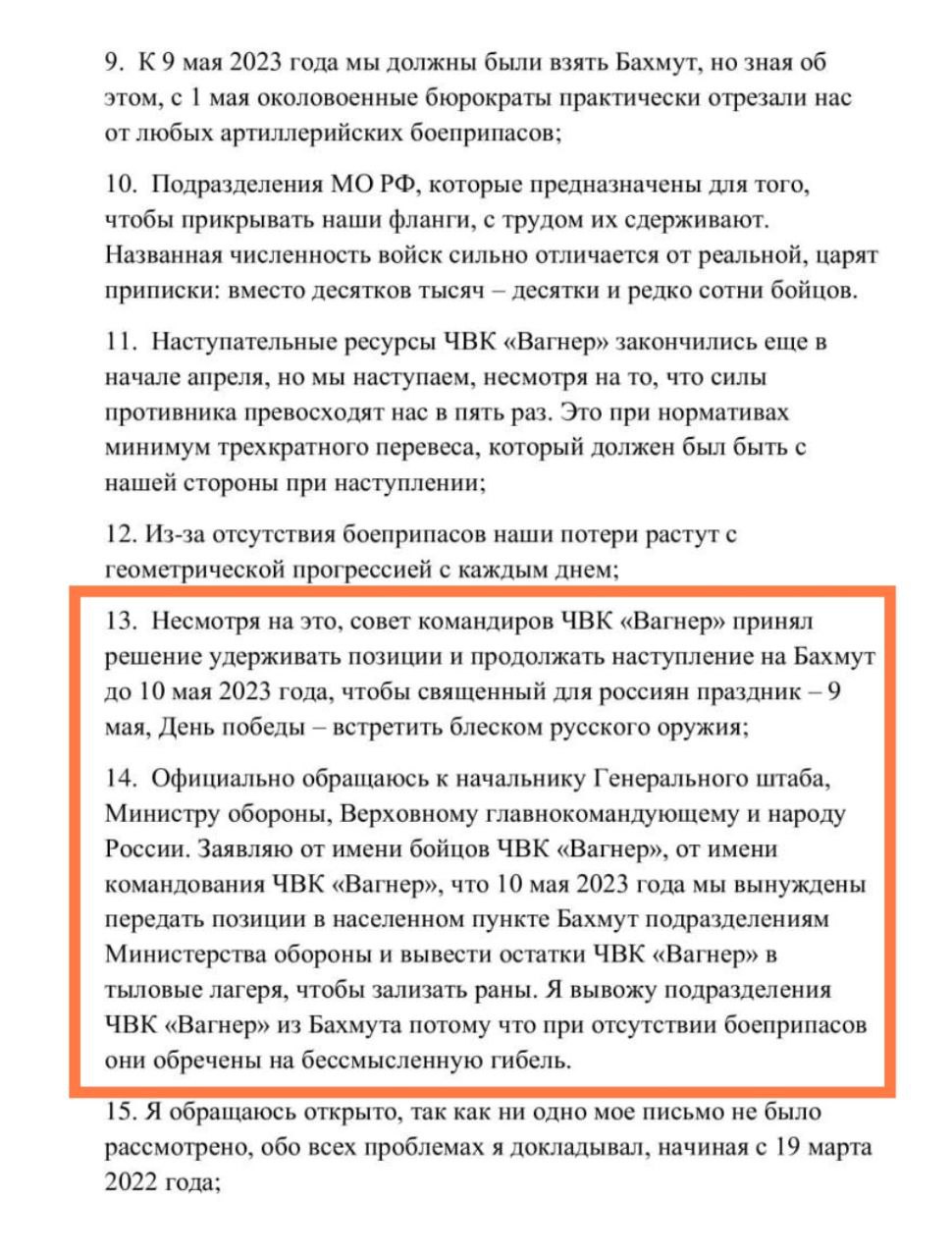 При этом решение Пригожина вывести ЧВК из Бахмута он назвал "неприятным". Прямо он его не осуждал, но привел примеры, когда сам оказывался в подобном положении (недостаток боеприпасов и техники), но не покинул позиции, а продолжил воевать.