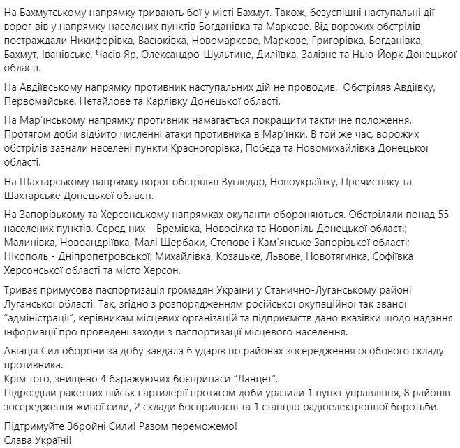 Помимо боев за Бахмут, противник атаковал Богдановку и Марково.
