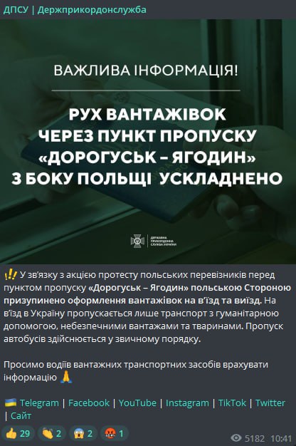 Польша приостановила оформление грузовиков на въезд и выезд перед пунктом пропуска "Дорогуск - Ягодин" в Волынской области в связи с акцией протеста польских перевозчиков.
