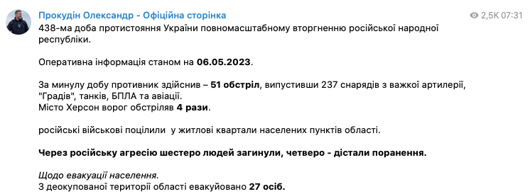 РФ совершила 51 обстрел области, выпустив 237 снарядов из тяжелой артиллерии, "Градов", танков, БПЛА и авиации. Херсон  обстреляли четыре раза.