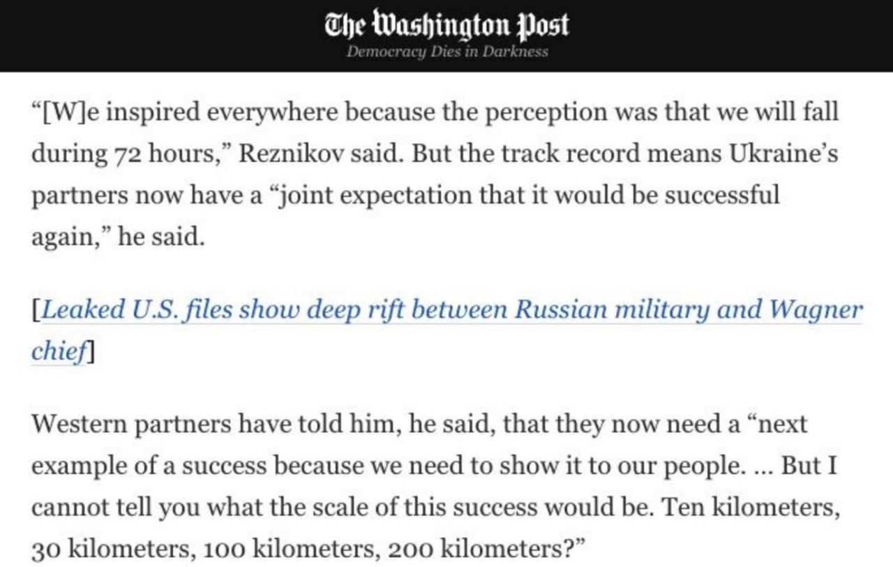 "Большинство людей ждут чего-то грандиозного, что может привести к эмоциональному разочарованию. Западные партнеры сказали мне, что теперь им нужен следующий пример успеха, потому что мы должны показать его нашим народам… Но я не могу вам сказать, каковы будут масштабы этого успеха. Десять километров, 30 километров, 100 километров, 200 километров? В идеале наступление должно перерезать тыловые цепи российских войск и снизить их наступательные возможности", - сказал министр.