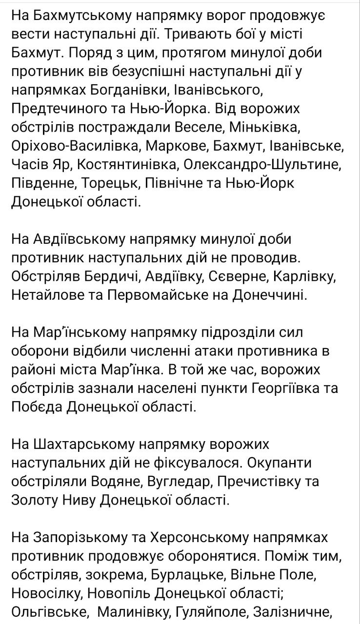 • Продолжаются бои за Бахмут. Также россияне атаковали Богдановку, Ивановское, Предтечино и Нью-Йорк.