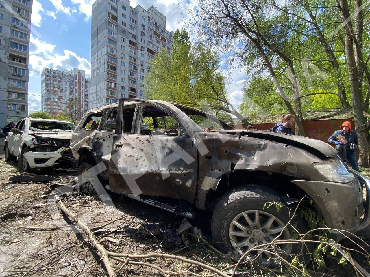 На месте падения дрона образовалась большая воронка. Всего повреждено 10 автомобилей. Одна машина сгорела полностью. Из местных жителей никто не пострадал.