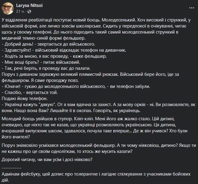 09.54 Детская писательница Лариса Ницой потребовала от ветерана войны в больнице благодарить ее на украинском языке.
