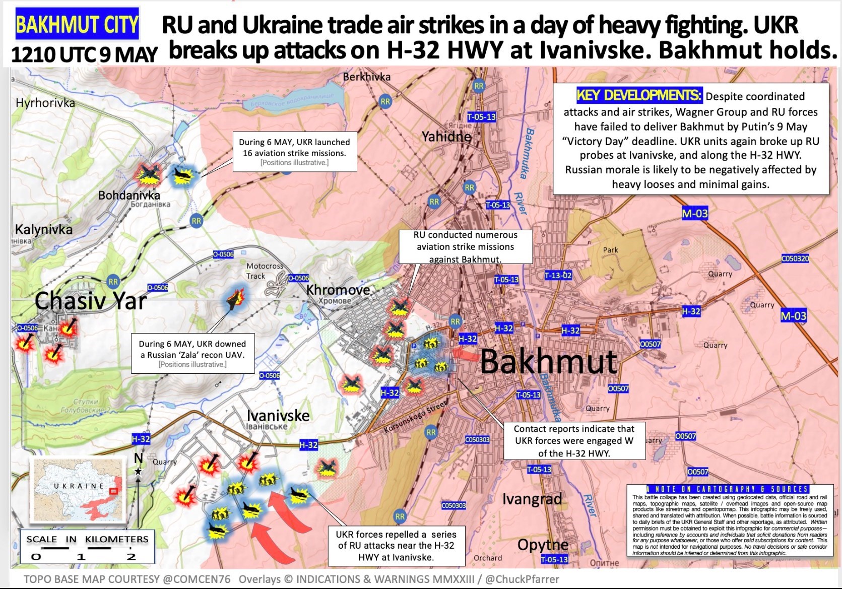 На момент публикации ни один из радикальных прогнозов на 9 мая не оправдался. Ни по параду на Красной площади удар не нанесли, ни Россия по правительственному кварталу не ударила, ни ВСУ не перешли в наступление. Из громких событий была разве что вторая серия бахмутского демарша Пригожина, но о ней мы расскажем чуть ниже.