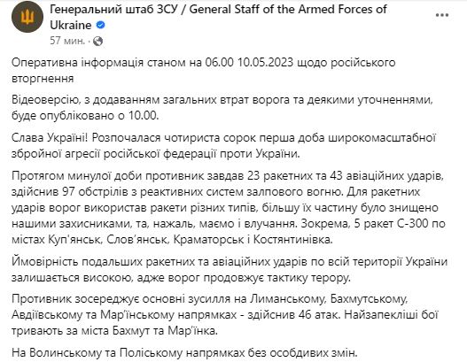 В среду, 10 мая, Генштаб ВСУ обнародовал сводку о ситуации на фронте.