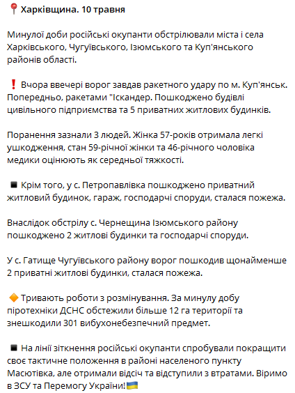 Один из наиболее серьезных обстрелов произошел в Купянске, где вчера вечером враг нанес ракетный удар, предположительно, с использованием ракет "Искандер". По меньшей мере пять жилых домов и здания гражданского предприятия получили повреждения.