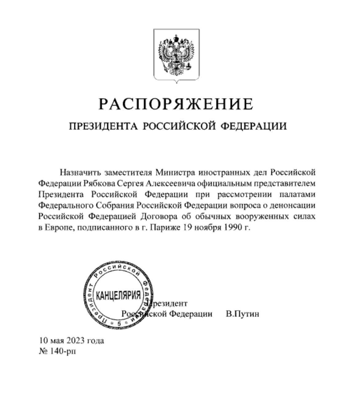 Россия, похоже, выходит из Договора об обычных вооруженных силах в Европе. Сегодня президент РФ Владимир Путин подписал распоряжение о назначении замглавы МИД Сергея Рябкова представителем на переговоры по денонсации ДОВСЕ.