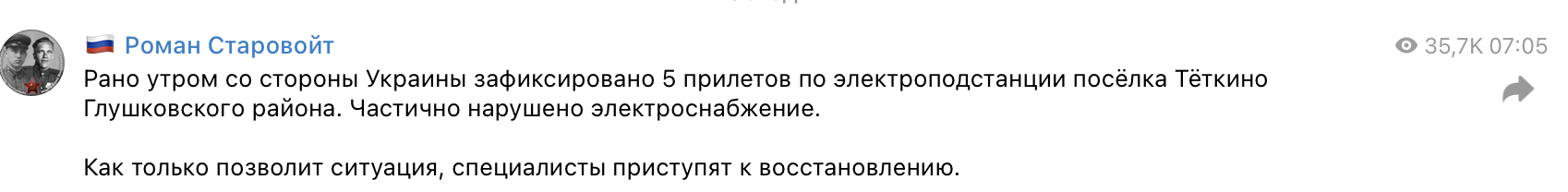 Губернатор Курской области РФ Роман Старовойт обвинил Украину в обстреле электроподстанции в посёлке Тёткино.