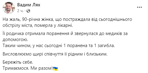 В Славянске из-за обстрела погиб один человек, еще один житель ранен. В больнице из-за травм умерла 90-летняя женщина.