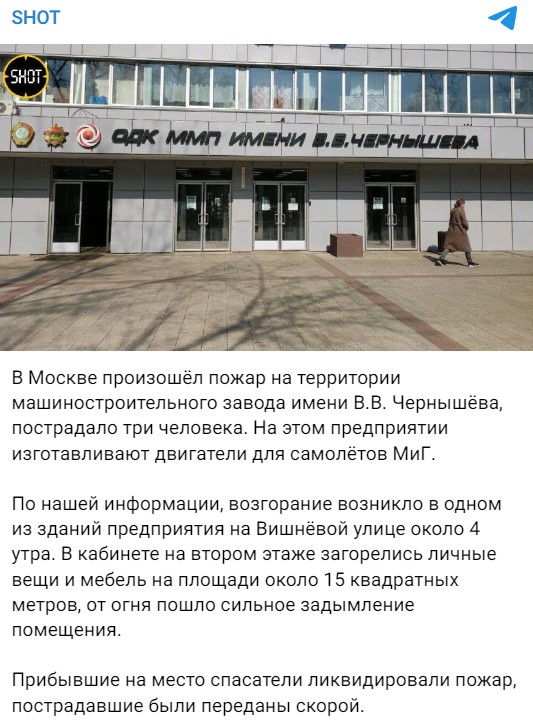 В ночь с 11 на 12 мая в Москве вспыхнул пожар на территории машиностроительного завода имени В.В. Чернышева. Там производят двигатели для самолетов МиГ.