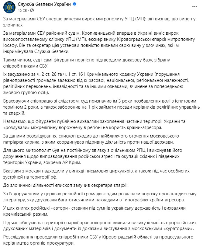 СБУ заявляет, что он и секретарь учреждения полностью признали вину по делу о нарушении равноправия граждан. Сообщается, что церковные служащие публично поддержали оккупацию территории Украины и "раздували" межрелигиозную рознь в пользу РФ.