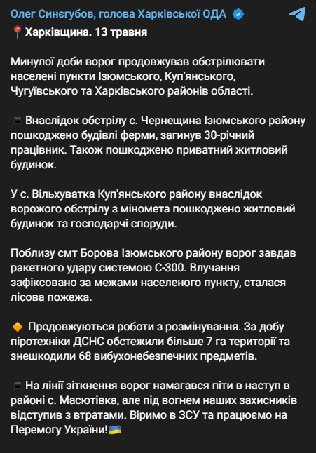 За прошедшие сутки российская армия обстреляла населенные пункты Изюмского, Купянского, Чугуевского и Харьковского районов области. В результате обстрела села Чернещина Изюмского района повреждены здания фермы, погиб 30-летний работник. Также поврежден частный жилой дом.