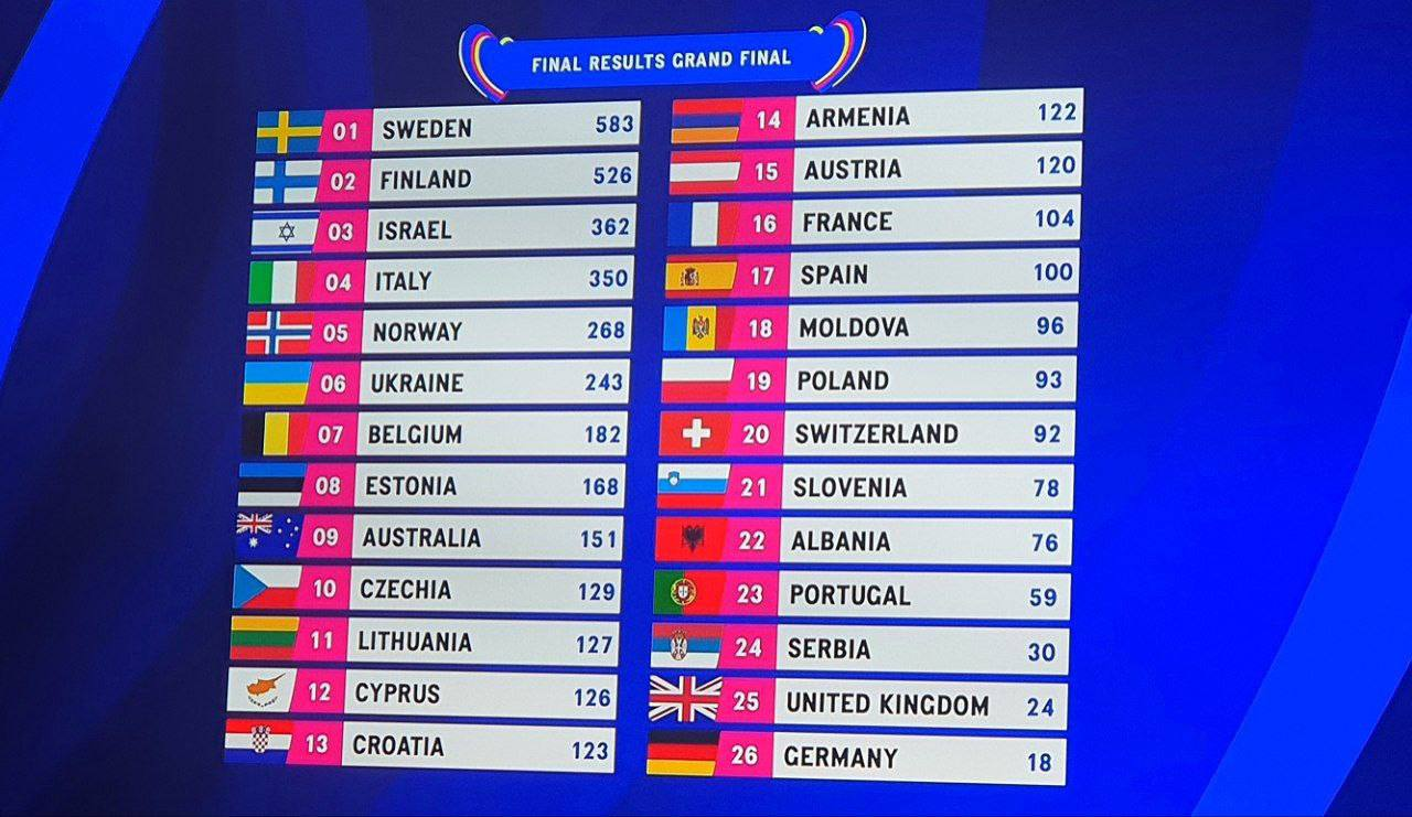 Швеция победила на "Евровидении-2023", Украина заняла шестое место. Результаты конкурса